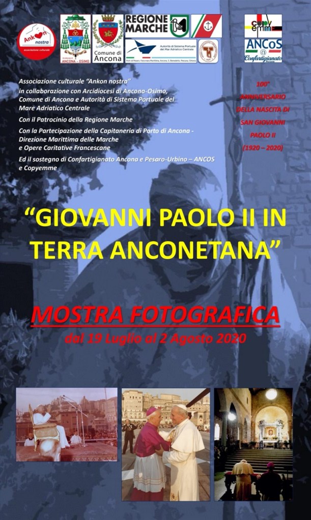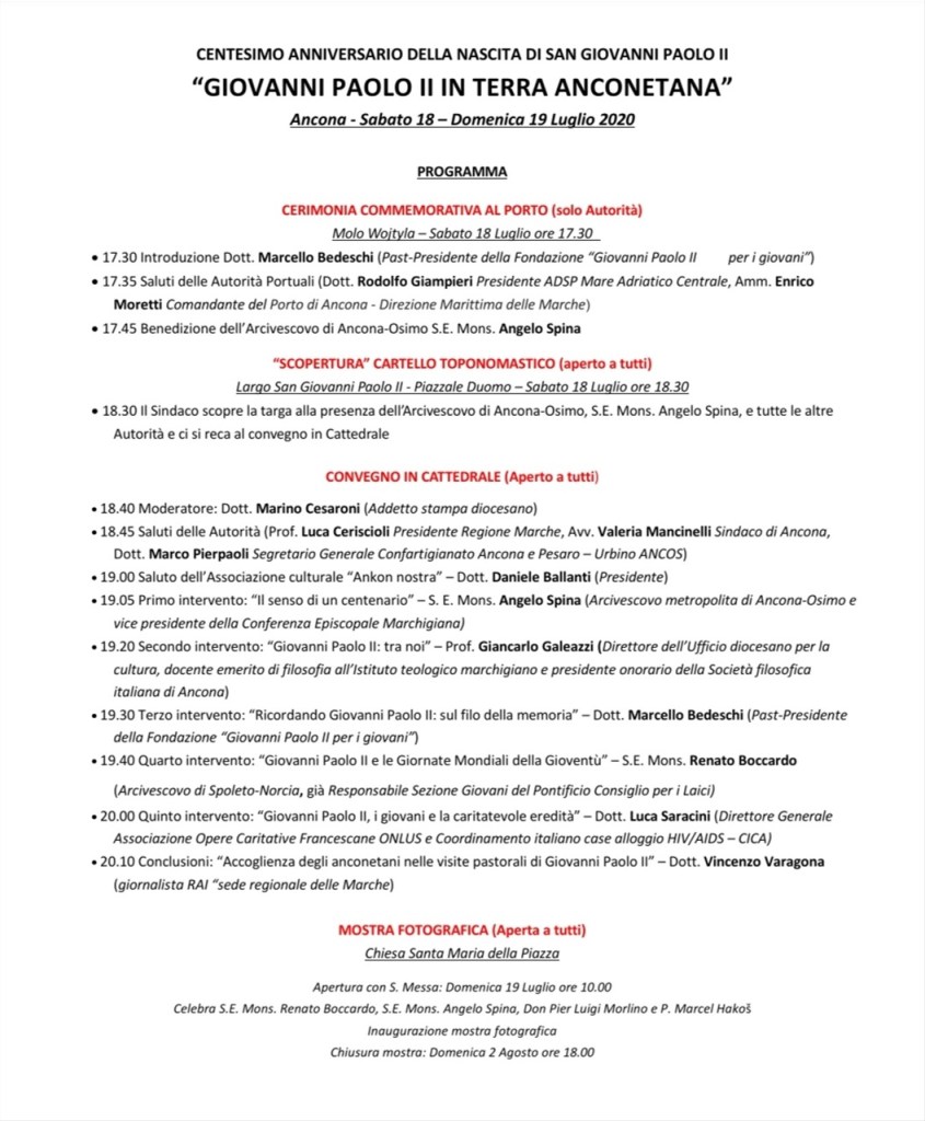 L’Associazione culturale “Ankon nostra”, in collaborazione con l’Arcidiocesi di Ancona-Osimo, il Comune di Ancona e l’Autorità di Sistema Portuale del Mare Adriatico Centrale, con il Patrocinio della Regione Marche, con la Partecipazione della Capitaneria di Porto di Ancona – Direzione Marittima delle Marche, le Opere Caritative Francescane e il sostegno di Confartigianato Ancona e Pesaro-Urbino – ANCOS e Copyemme, organizza una serie di iniziative, la prima in Italia delle diverse organizzate in diversi Paesi del Mondo per il Centenario della nascita di San Giovanni Paolo II, che si articoleranno nel pomeriggio di sabato 18 e domenica 19 luglio, con Commemorazioni al Porto, la “scopertura della targa toponomastica dedicata al Santo e un convegno a San Ciriaco e l’inaugurazione di una mostra presso la Chiesa di Santa Maria della Piazza che resterà aperta sino a domenica 2 agosto. Il programma prevede per sabato 18 luglio alle ore 12.00, presso il Molo Wojtyla del porto di Ancona una cerimonia riservata alle Autorità civili, militari e religiose: ore 12.00 introdurrà Marcello Bedeschi, Past-President della Fondazione “Giovanni Paolo II per i giovani”; ore 12.10 saluti delle Autorità Portuali: Rodolfo Giampieri Presidente ADSP Mare Adriatico Centrale, Enrico Moretti Comandante del Porto di Ancona – Direzione Marittima delle Marche; ore 12.25 benedizione di Sua Ecc. Mons. Angelo Spina Arcivescovo Metropolita Ancona-Osimo. Sempre sabato 18 luglio alle ore 18.30 nel Piazzale del Duomo, nelle adiacenze della statua di San Giovanni Paolo II, il Sindaco di Ancona Valeria Mancinelli procederà alla scopertura di un cartello toponomastico: “Largo San Giovanni Paolo II – Piazzale Duomo”. Immediatamente dopo, alle ore 18.40, si aprirà il Convegno nella Cattedrale di San Ciriaco, dove saranno messe in atto le procedure previste per il contenimento della diffusione del Coronavirus, secondo il seguente programma: Moderatore: Marino Cesaroni direttore del quindicinale diocesano Presenza; 18.45 Saluti delle Autorità: Luca Ceriscioli Presidente della Regione Marche, Valeria Mancinelli Sindaco di Ancona, Marco Pierpaoli Segretario Generale Confartigianato Ancona e Pesaro – Urbino ANCOS, 19.00 Saluto del Presidente dell’Associazione culturale “Ankon nostra” Daniele Ballanti. 19.05 “Il senso di un centenario” – Sua Ecc. Mons. Angelo Spina, Arcivescovo metropolita di Ancona-Osimo e vice presidente della Conferenza Episcopale Marchigiana; 19.20 “Giovanni Paolo II: tra noi” – Giancarlo Galeazzi, Direttore dell’Ufficio pastorale diocesano per la cultura, docente emerito di filosofia all’Istituto teologico marchigiano e Presidente onorario della Società filosofica italiana di Ancona; 19.30 “Ricordando Giovanni Paolo II: sul filo della memoria” – Marcello Bedeschi, Past-Presidente della Fondazione “Giovanni Paolo II per i giovani”; 19.40 “Giovanni Paolo II e le Giornate Mondiali della Gioventù” – Sua Ecc. Mons. Renato Boccardo, Arcivescovo di Spoleto-Norcia, già Responsabile Sezione Giovani del Pontificio Consiglio per i Laici; 20.00 “Giovanni Paolo II, i giovani e la caritatevole eredità” – Luca Saracini, Direttore Generale Associazione Opere Caritative Francescane ONLUS e Coordinamento italiano case alloggio HIV/AIDS – CICA; 20.10 “Accoglienza degli anconetani nelle visite pastorali di Giovanni Paolo II” – Vincenzo Varagona, giornalista RAI “sede regionale delle Marche. (Essendo lo spazio del piazzale limitato, per la sosta delle auto, si consiglia di utilizzare la linea urbana 11, corsa in partenza da Piazza Cavour, angolo Corso Mazzini, alle ore 18.00; l’ultima corsa dal Duomo per il centro è alle ore 19.50) Domenica 19 luglio alle ore 10.00 Santa Messa nella chiesa di Santa Maria della piazza, concelebrata da Sua Ecc. Mons. Renato Boccardo, Sua Ecc. Mons. Angelo Spina, Don Pierluigi Morlino, Padre Marcel Hakoš e inaugurazione della Mostra Fotografica che resterà aperta sino alle ore 18.00 del 2 agosto. La cittadinanza è invitata.