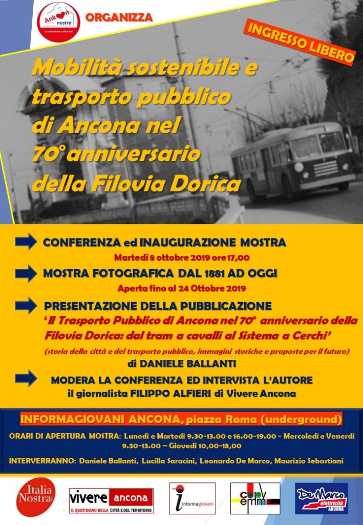 Per sensibilizzare un trasporto pubblico sostenibile nel 2019 ho ideato il 70° anniversario della Filovia Dorica e assieme all’Associazione culturale Ankon nostra l’abbiamo realizzato. Ricorrenza «dimenticata» da Conerobus e dall’Amministrazione Comunale i quali, seppur invitati al 70°, non hanno dato nessuna risposta all’invito. Eppure oggi il filobus è il miglior alleato nella lotta alle emissioni inquinanti! Altre città dimostrano di crederci: Milano ha celebrato pochi mesi fa l’85° del filobus, ad Ancona questa ricorrenza è stata celebrata solo dalla nostra Associazione!