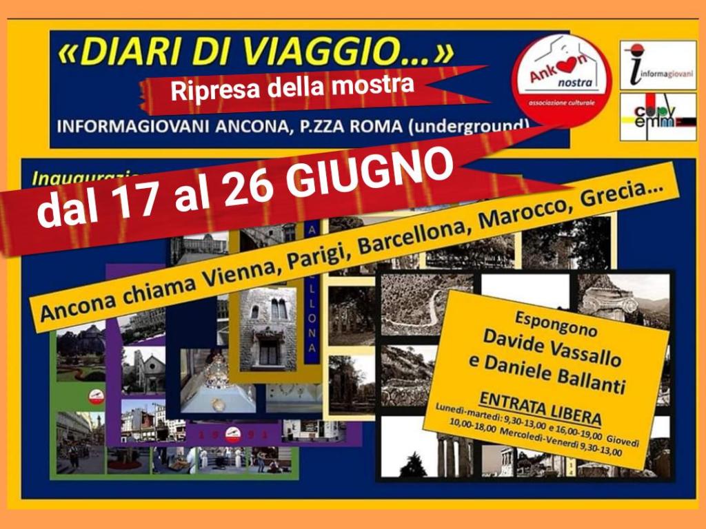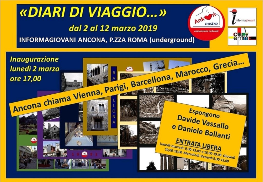 Mostra fotografica da Informagiovani Ancona (piazza Roma – underground), orari di apertura: lunedì e martedì dalle 9.30 alle 13.00 e dalle 16.00 alle 19.00, giovedì dalle 10.00 alle 18.00, mercoledì e venerdì dalle 9.30 alle 13.00. Ingresso libero.