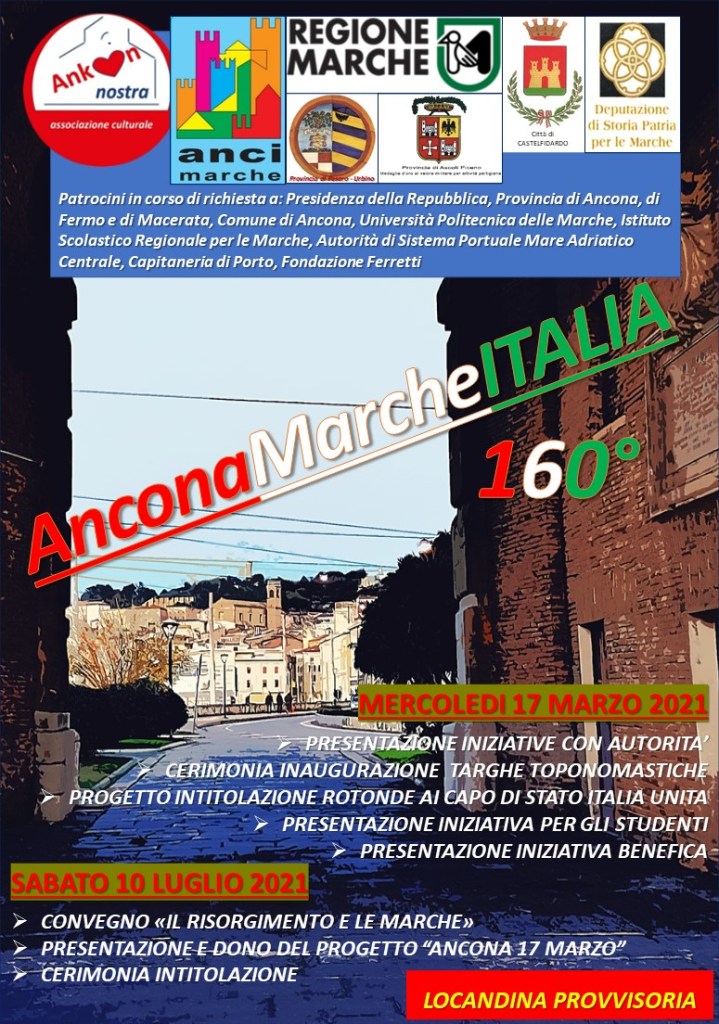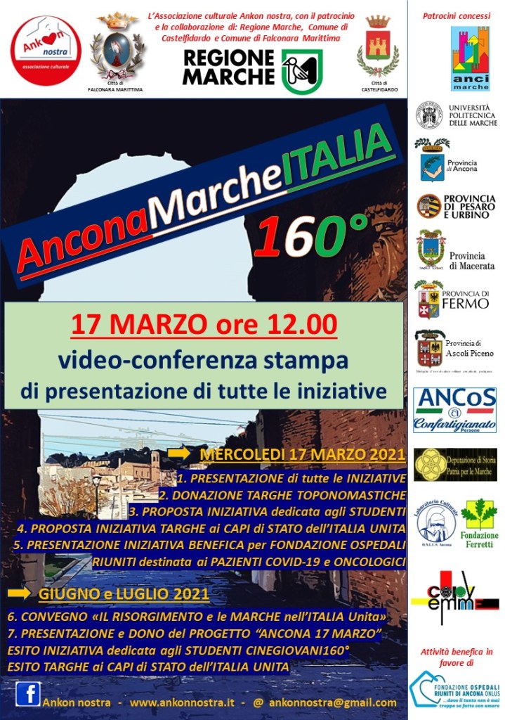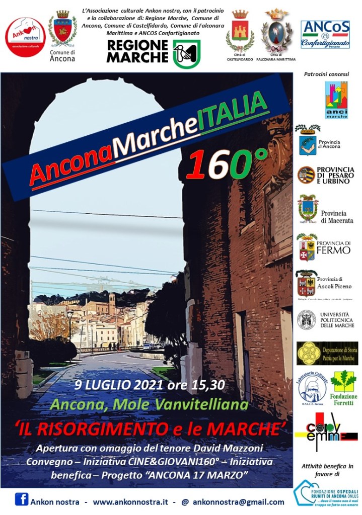 Evento conclusivo di AnconaMarcheITALIA160° nel 160° anniversario dell’Unità d’Italia: Convegno, CINE&GIOVANI160° ideato con l’obiettivo di trasmettere alle nuove generazioni il valore dell’Unità Nazionale, dono alle Istituzioni del Progetto urbanistico “Ancona 17 marzo” e partecipazione alla proiezione film che abbiamo proposto sul Risorgimento a Castelfidardo il 2 luglio e al convegno Falconara Marittima come collaborazione con Ankon nostra l’8 luglio. Mole Vanvitelliana gentilmente messa a disposizione dal Comune di Ancona. Apertura con Aria cantata dal tenore David Mazzoni. Entrata convegno gratuita, programma all’interno.