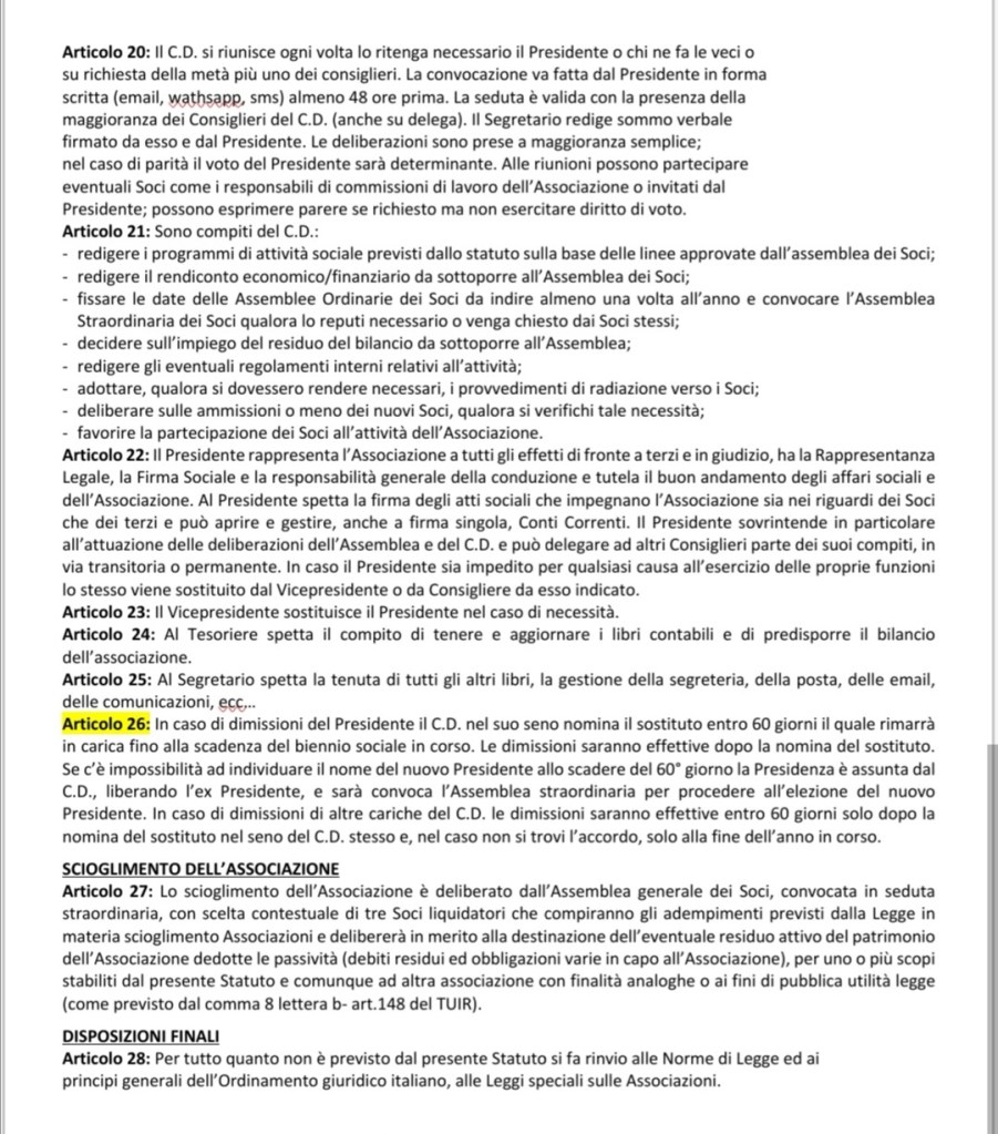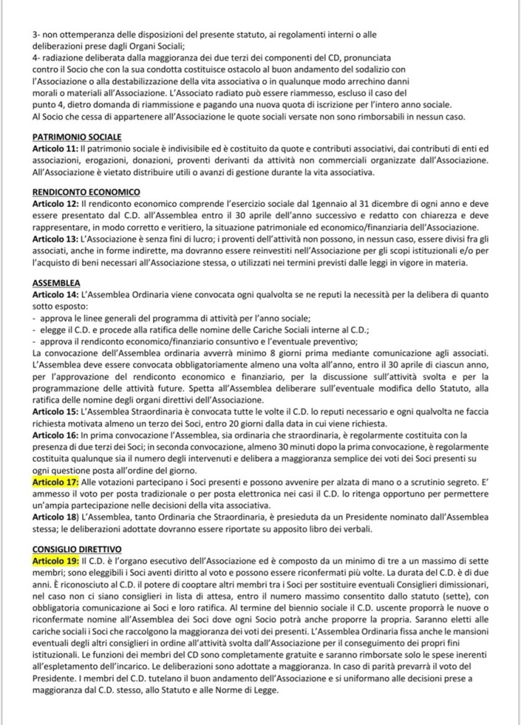 Si fa presente che nessuno, al di fuori del Presidente e del Direttivo, rappresenta l’Associazione, né può parlare a nome di essa e soprattutto non può avvalersi del diritto di rivendicare attività svolte nel seno dell’Associazione stessa per il periodo in cui ne ha fatto parte in passato, perché ogni attività è o frutto del Presidente o dei componenti del Consiglio Direttivo in carica e che una volta approvati diventano di esclusiva proprietà dell’Associazione.